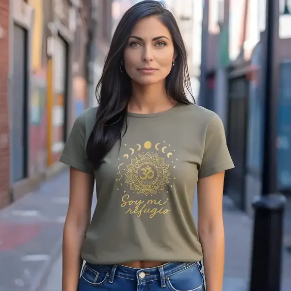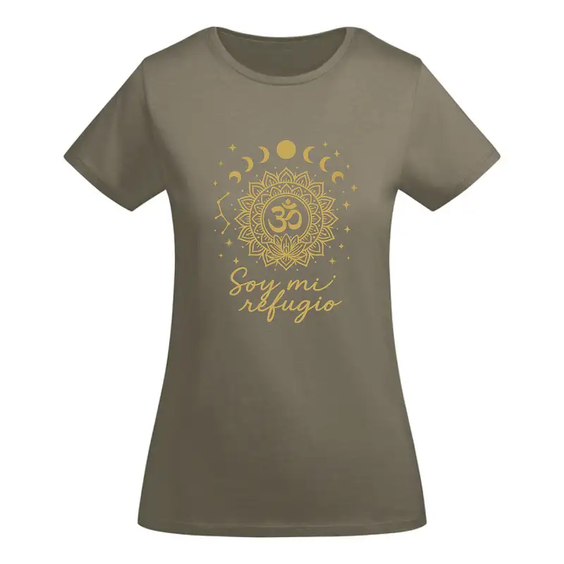 El diseño de esta camiseta representa la conexión entre el universo y el ser interior. El símbolo Om, rodeado de fases lunares y estrellas, transmite calma, espiritualidad y fuerza. El mensaje “Soy mi refugio” invita a la introspección, al autocuidado y a encontrar paz dentro de una misma.