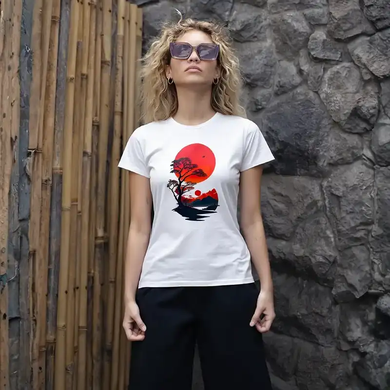 Camiseta de algodón orgánico para mujer con ilustración artística de un árbol bajo la luna roja. Una prenda sostenible, cómoda y alternativa que conecta naturaleza, calma y estilo único.